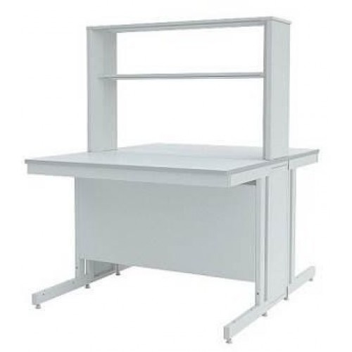 Стол островной ЛК-1500 СО состоит из прочного сборно-разборного металлического каркаса с полимерным покрытием серого цвета, технологической приставки с двумя полками из стали и столешницы.