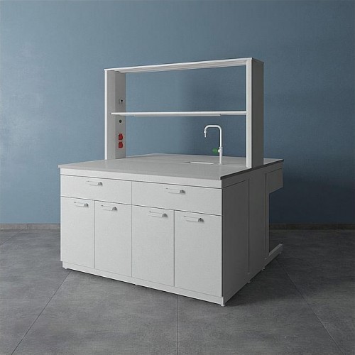 Стол островной ЛК-1500 СО дополнительно может комплектоваться различными тумбами, а также сливными раковинами, кранами для подвода воды или газа (сжатого воздуха), которые монтируются в технологическую приставку.