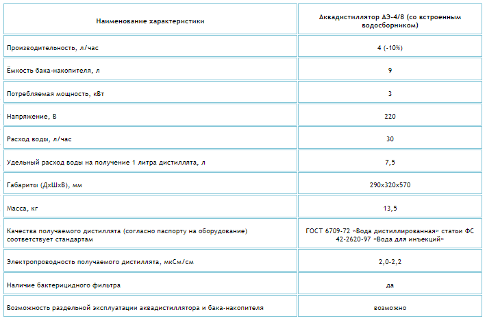 - Низкий удельный расход воды для получения 1 литра дистиллированной воды.