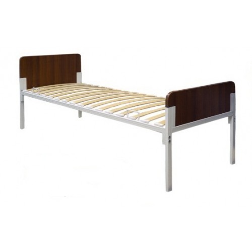 Каркас кровати изготовлен из тонкостенного стального профиля с нанесением экологически чистой эпоксидной полимерно-порошковой краски, устойчивой к регулярной обработке дезинфицирующими и моющими средствами.