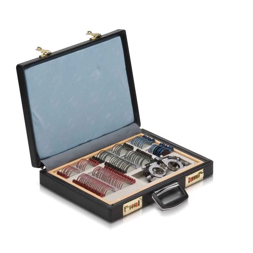 Набор пробных очковых линз укомплектован пробной универсальной оправой ОПУ и поставляется в кожаном чемодане.