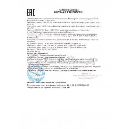 Габариты (ДхШхВ) (± 5%), мм 500х495х395 Площадь сиденья (ДхШ) (± 5%), мм 305х495 Высота сиденья (± 5%), мм 395-570 Грузоподъемность, кг 110±1 Масса (нетто / брутто) (± 5%), кг 2,06/2,28